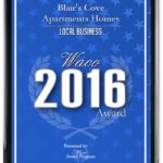 WACO November 21, 2016 — Blair’s Cove Apartments Homes has been selected for the 2016 Waco Award in the Local Business category by the Waco Award Program. Each year, the Waco Award Program identifies companies that we believe have achieved exceptional marketing success in their local community and business category. These are local companies that enhance the positive image of small business through service to their customers and our community. These exceptional companies help make the Waco area a great place to live, work and play. Various sources of information were gathered and analyzed to choose the winners in each category. The 2016 Waco Award Program focuses on quality, not quantity. Winners are determined based on the information gathered both internally by the Waco Award Program and data provided by third parties.